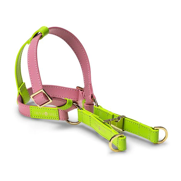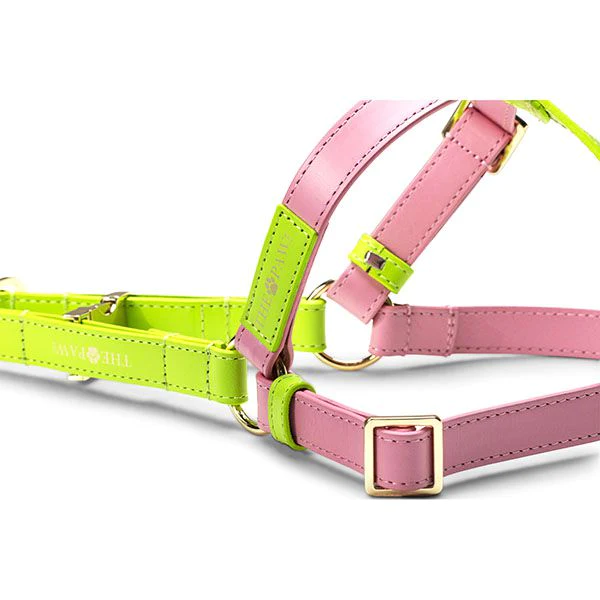 The Paw Co’s vibrant Pink and Lime Green Abigale step-in Dog Harness is designed to ensure durability and function. It features a step-in design that is choke-free and adjustable. The Paw Co’s Sasha harness is the ultimate mix of sophistication, style and comfort, and it will last a lifetime with proper care. Made from 100% Teal and Navy Blue Italian leather with polished rose gold hardware and gold silk printed monogram The Paw Co logo.